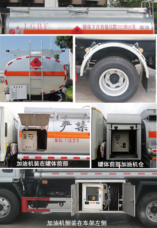 | 配置 | 1、該車適用于危險品運輸,運送危險貨物車輛類型為:FL型,類項號:3。運輸介質:柴油、煤油、汽油,密度:830、800、700千克/立方米,罐體有效容積4.5立方米,罐體外形尺寸(長×寬×高)(mm):①加油機側裝在車架左側:3800×1600×1000,②加油機裝在罐體前部:3800×1750×1220(加油機倉長800);③選裝罐體前加油機倉:3000×1750×1220。罐體上部選裝折疊護欄、選裝無上走道;選裝弧形擋泥板。2、側防護采用冷彎型鋼/Q235,螺栓連接。后防護采用冷彎型鋼/Q235,焊接,截面高100mm,截面寬50mm,下邊緣離地高450mm。加油機型號及生產企業(yè):BL1111Z/珠海市貝林加油設備有限公司中山分公司,HS1812B/托肯恒山科技(廣州)有限公司,SKES-1112/恒和嘉華科技有限公司(上海伯萊機械有限公司),SK20QF-111A、SK20QF-222A/鄭州三金石油設備制造有限公司,CS20D1110F/正星科技有限公司,JSK-70B1121CZ,JSK-70B1121C,JSK45B1121C/穩(wěn)恩佳力佳(北京)石油化工設備有限公司, ZH6444/佛山市眾澤機電科技有限公司, XTST121BF1/邢臺正潤通科技發(fā)展有限公司,TA-1111KFJ/沈陽航天新陽機電有限公司。3、隨底盤選裝前面罩,前保險杠,前組合燈具,選裝左右油箱位置。僅選用排氣管前置、限速裝置(限速80km/h)、前輪盤式制動及子午線輪胎的底盤,安裝帶有衛(wèi)星定位功能的行駛記錄儀。ABS廠家及型號:襄陽東風隆誠機械有限責任公司/ABS/ASR-24V-4S/4M。轉向輪安裝輪胎爆胎應急防護裝置。 | ||