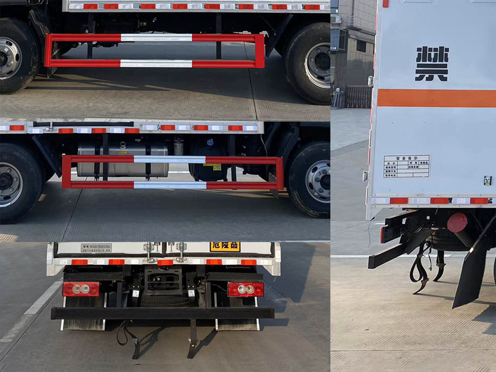 | 其它: | 1、該車(chē)適用于運(yùn)輸危險(xiǎn)品。廂體頂部封閉不可開(kāi)啟。運(yùn)輸具有獨(dú)立容器(瓶)包裝的物品,運(yùn)送危險(xiǎn)物品類(lèi)項(xiàng)號(hào):6.1,6.2。2、側(cè),后防護(hù)材料均為Q235,螺栓連接;后防護(hù)截面尺寸100×50mm,下邊緣離地高410mm。廂體側(cè)面選裝開(kāi)門(mén)型式及位置,選裝不帶側(cè)開(kāi)門(mén),選裝瓦楞板結(jié)構(gòu);選裝百葉窗。3、隨底盤(pán)選裝排半駕駛室。僅選用排氣管前置、限速裝置(限速80km/h)、前輪盤(pán)式制動(dòng)及子午線(xiàn)輪胎的底盤(pán);轉(zhuǎn)向輪裝備輪胎爆胎應(yīng)急防護(hù)裝置。安裝帶衛(wèi)星定位功能的行駛記錄儀。ABS系統(tǒng)型號(hào):ABS-VI.E;生產(chǎn)企業(yè):廣州瑞立科密汽車(chē)電子股份有限公司;ABS系統(tǒng)型號(hào):ABS-E;生產(chǎn)企業(yè):威伯科汽車(chē)控制系統(tǒng)(中國(guó))有限公司;ABS系統(tǒng)型號(hào):ABS8.8 ECU 24V,生產(chǎn)企業(yè):東科克諾爾商用車(chē)制動(dòng)系統(tǒng)(十堰)有限公司;發(fā)動(dòng)機(jī)/油耗值(L/100km)對(duì)應(yīng)關(guān)系為:CY4SK261/16.09,D30TCIF1/16.19,F2.8NS6B156/15.39,F3.8NS6B156/14.90??蛇x裝ETC車(chē)載裝置。 | ||